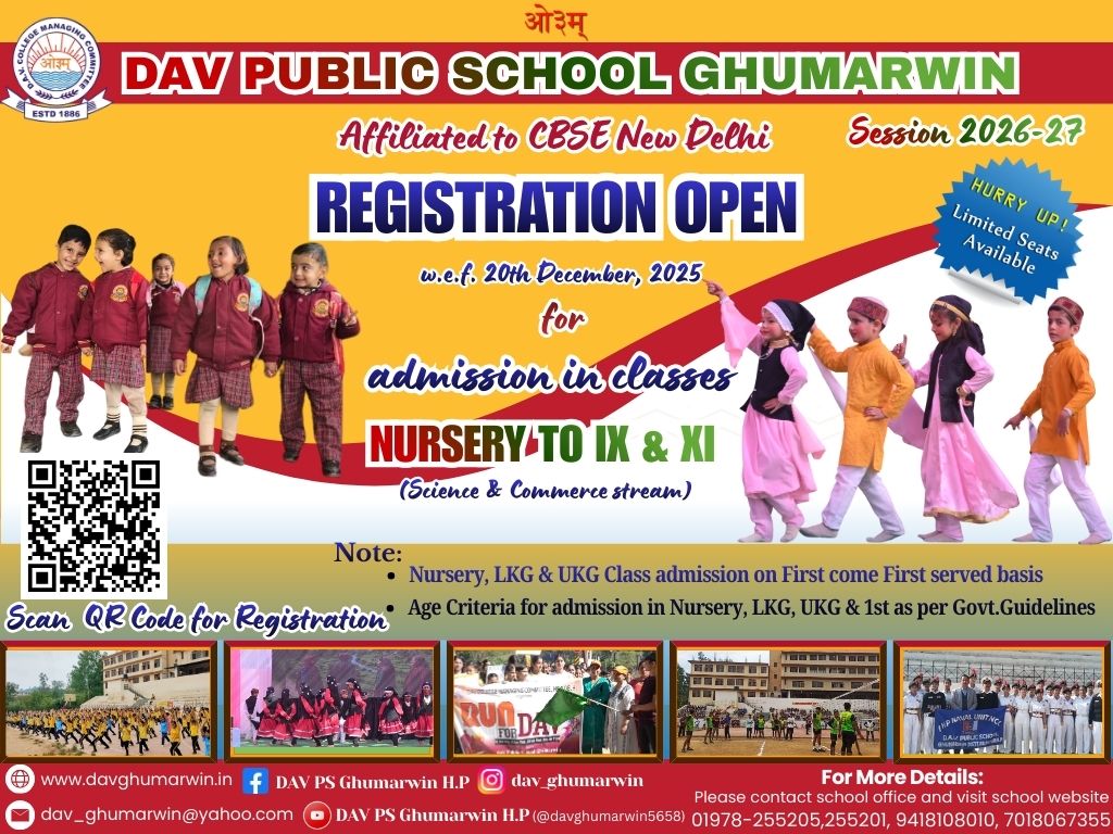 DAV PUBLIC SCHOOL, Ghumarwin Ghumarwin, Bilaspur, Himachal Pradesh - 174021 Transport Section: +919805153496, 9882191005 Fees Enquiry: 01978-255201 General Enquiry: 01978-255205 Academy Enquiry: 01978-255206 E-Mail Id: dav_ghumarwin@yahoo.com<
